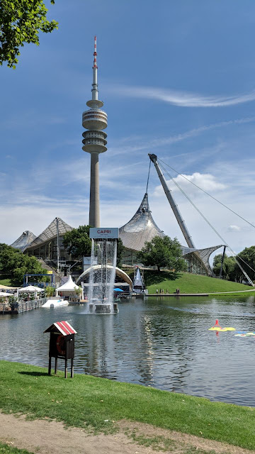 И еще покажу немного фото Олимпийского парка, от которого я в восхищении! Мы живем в 25 минутах ходьбы от этого места. Он прекрасно вписывается в город и активно используется для всевозможных мероприятий для горожан и гостей Мюнхена. Там все время что-то происходит. Как то фестиваль, концерт на десятки тысяч зрителей, выставка, ярмарка или ночной блошиный рынок, праздник одного дня или большой food cort. И конечно, там можно позаниматься спортом. Днем там можно гулять, пока ноги не загудят, подняться на холм и посмотреть на город сверху, забраться на телебашню, или просто поваляться на газоне - позагорать или устроить пикник в тени дубов. Мне очень нравится, как парк и все объекты в нем выглядят спустя десятилетия после Олимпиады. Всё очень ухоженное, и всё при деле.
